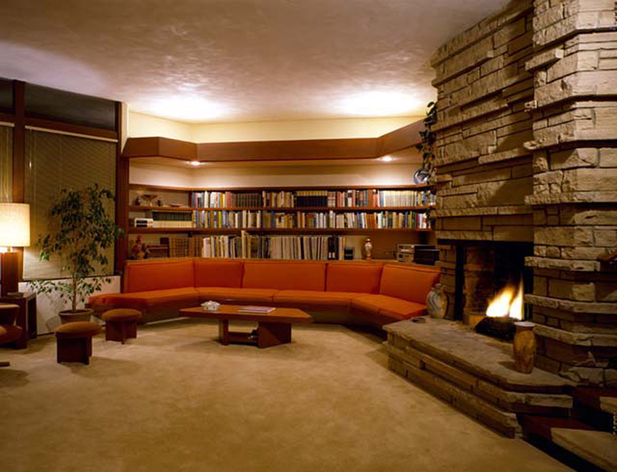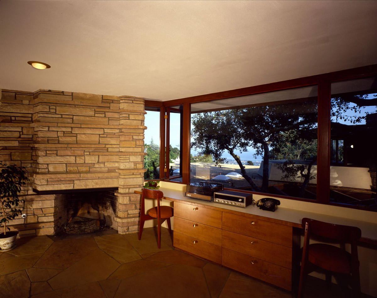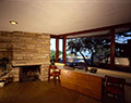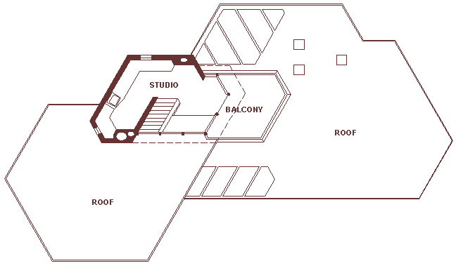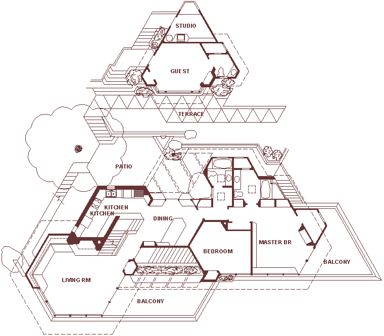 The influence of two famous Frank Lloyd Wright buildings can be seen this design. The rough ashlar stonework contrasting with the smooth cantilevered balconies are reminiscent of the famous Fallingwater in Mill Run, Pennsylvania. The plan grid of 4-foot equilateral triangles was adapted from Wright's hexagonal honeycomb module first used in the Hanna House located in Palo Alto, California. The composition, however, is original. |