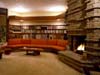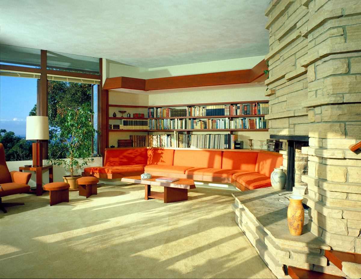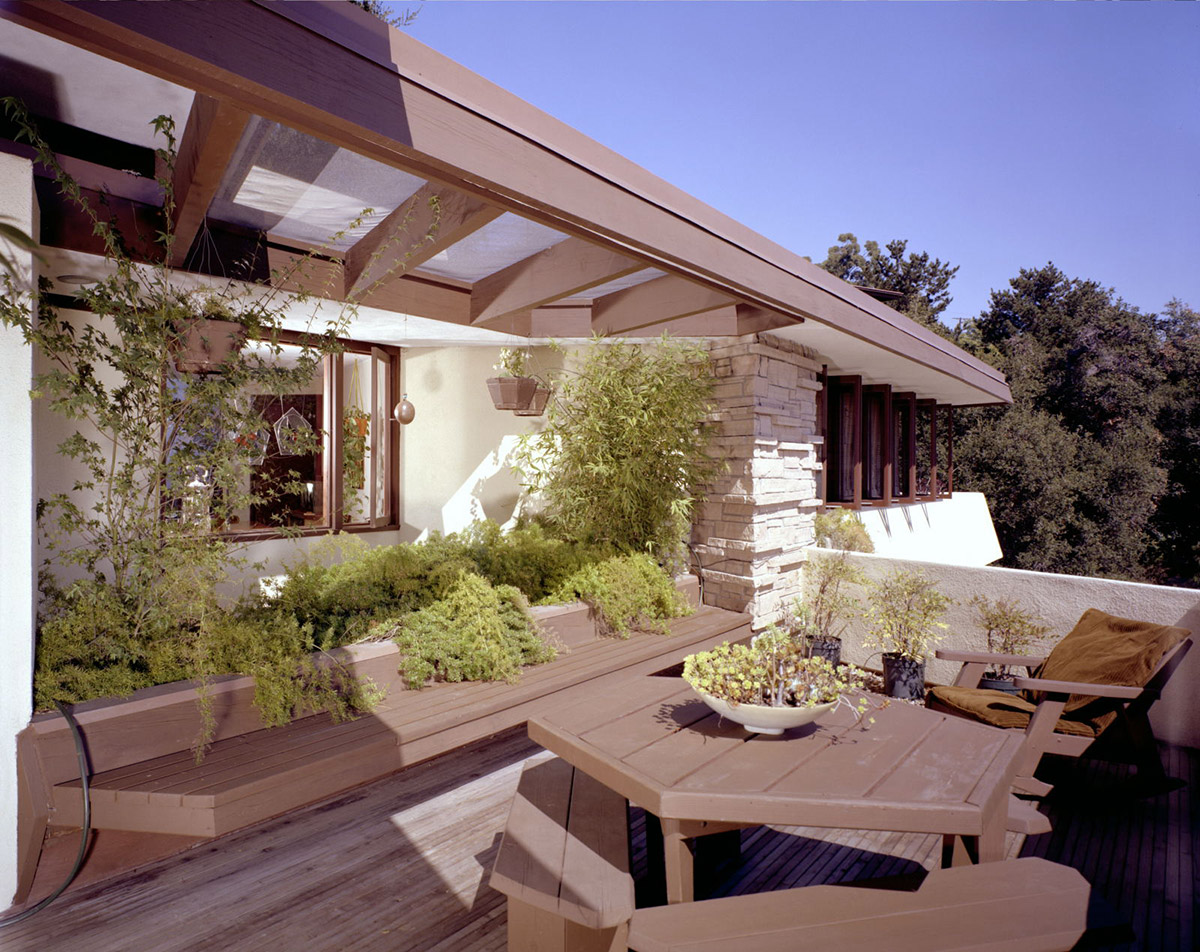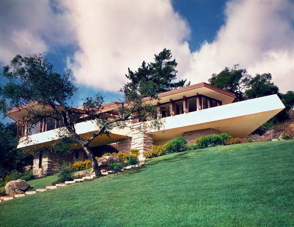 The influence of two famous Frank Lloyd Wright buildings can be seen this design. The rough ashlar stonework contrasting with the smooth cantilevered balconies are reminiscent of the famous Fallingwater in Mill Run, Pennsylvania. The plan grid of 4-foot equilateral triangles was adapted from Wright's hexagonal honeycomb module first used in the Hanna House located in Palo Alto, California. The composition, however, is original. |