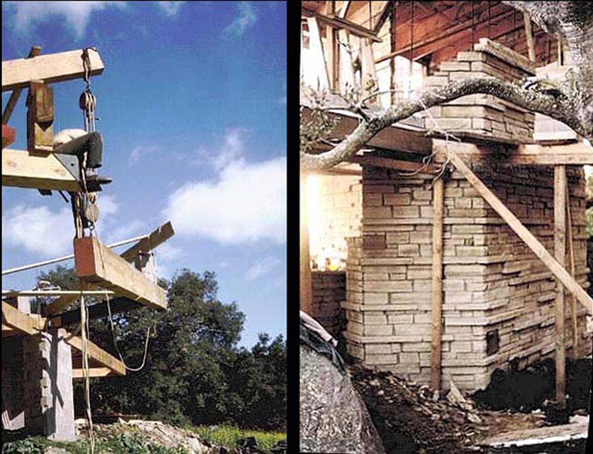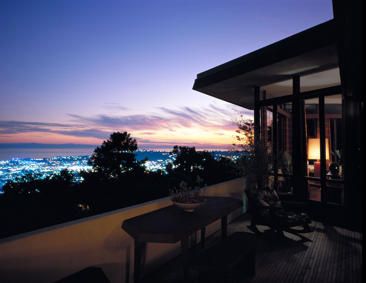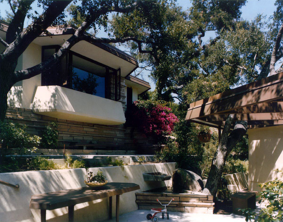 LOS ANGELES TIMES HOME MAGAZINEJULY 20, 1969Produced and Photographed by Ken BatesClifford Hickman says he'd wanted to build his own house ever since he took a drafting course in the 7th grade. Later he got to know the work of Frank Lloyd Wright and was strengthened in his resolution. Then, when almost through college, he decided the time was ripe. His parents loaned him some money and he left Greencastle, Ind., and came to Santa Barbara. There he bought a third of an acre high in the Riviera district and began to build this house. He was 24 and worked alone. It took him four years and the only things he subcontracted were the sewer, roofing and plastering. He didn't trust a bulldozer, so he moved all the earth by wheelbarrow. He learned plumbing from a book in the library, wiring from a copy of the local code. "I wanted to build it with my own two hands," he says. "I was almost jealous of anyone else who worked on the house. Like a sculptor, I wanted to do it myself." "As soon as I got started," Clifford Hickman says, "I got out my stereo so I could listen to music while I worked. Much of it was done to Mozart masses, Beethoven sonatas and composers like Bach, Schubert, Hindemith and Stravinsky. The stonework was done to Vivaldi's 'Four Seasons' because it was fast and make me work hard. "The fellow who sold me the sandstone--from the Kaibab area of Arizona--said it was the biggest order he'd ever had from Santa Barbara. I'd never laid a piece of stone in my life and was scared to death. I literally learned it from the ground up. "Usually people start out with big ideas, then cut back as costs rise. I never cut back on my original design. In fact, the house grew as I went along. I built one wall three times before I got it the way I wanted it." Hickman also made the furniture seen in the living room, at right and at left below. The kitchen is at lower right, and the patio on the uphill side is on the facing page. This is an all-electric house, heated radiantly by cables in the ceiling. It seems much larger than its 1,700 square feet, owing largely to the balcony that cantilevers 18 feet. There are 600 square feet of decks. "This project had no hump," Hickman concludes. "I thought there'd be a turning point when things would get easier, but no. It was hard work .all the way. |