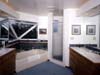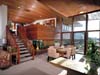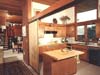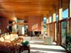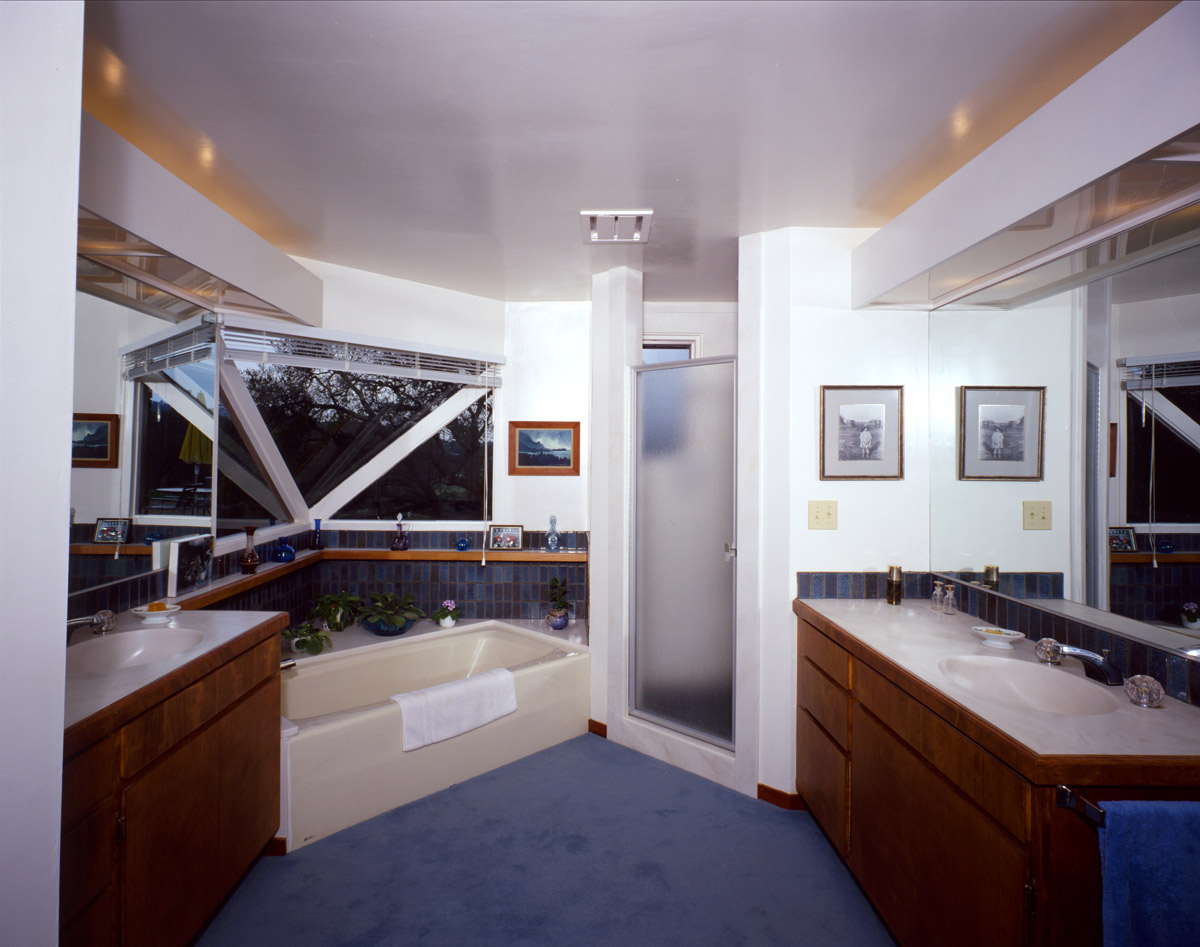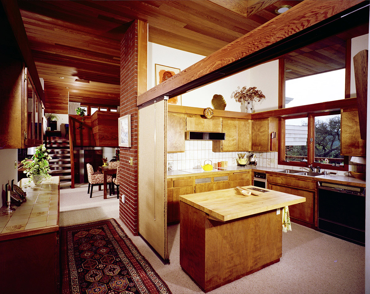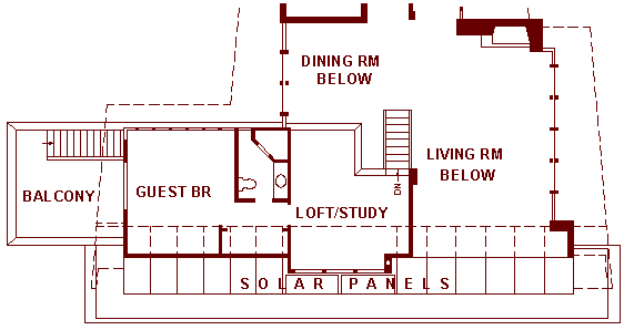 This is a very informal split-level two-bedroom plan design for two people. Because of the large oak trees on the south side of the house it was decided to put the solar panels on the roof. The solar engineer determined the best angle for the panels which in turn resulted in the unusual shape of the home. The resulting interior spaces are marvelous with one large space flowing from area to area. |